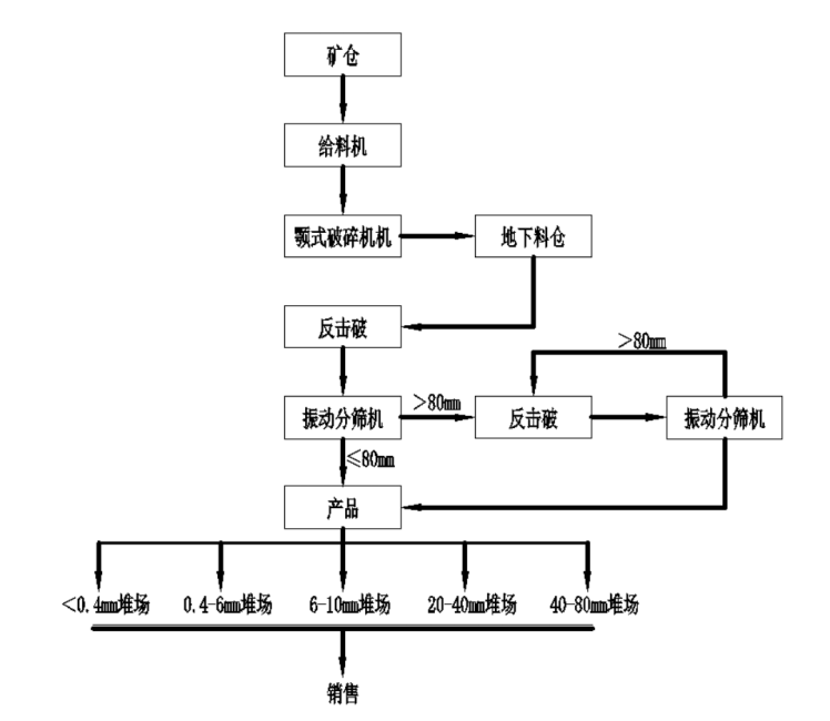 礦山現有破碎站采用兩級破碎、兩級篩分的閉路返回流程,機械化程度較高,可將礦石加工成不同需求的五級原料。破碎后的礦石原料對外進行銷售,礦石加工工藝系統(tǒng)流程圖如下:
