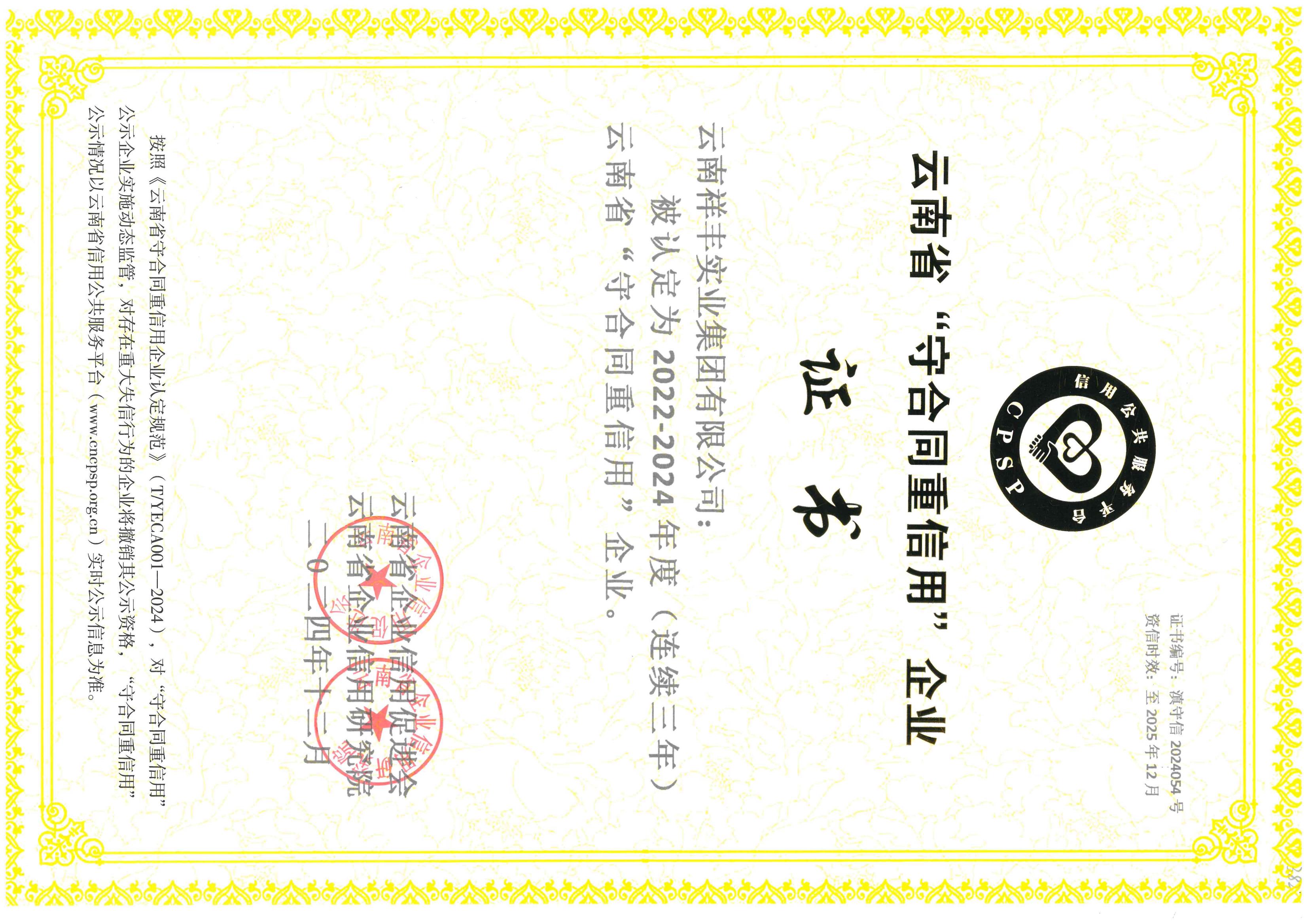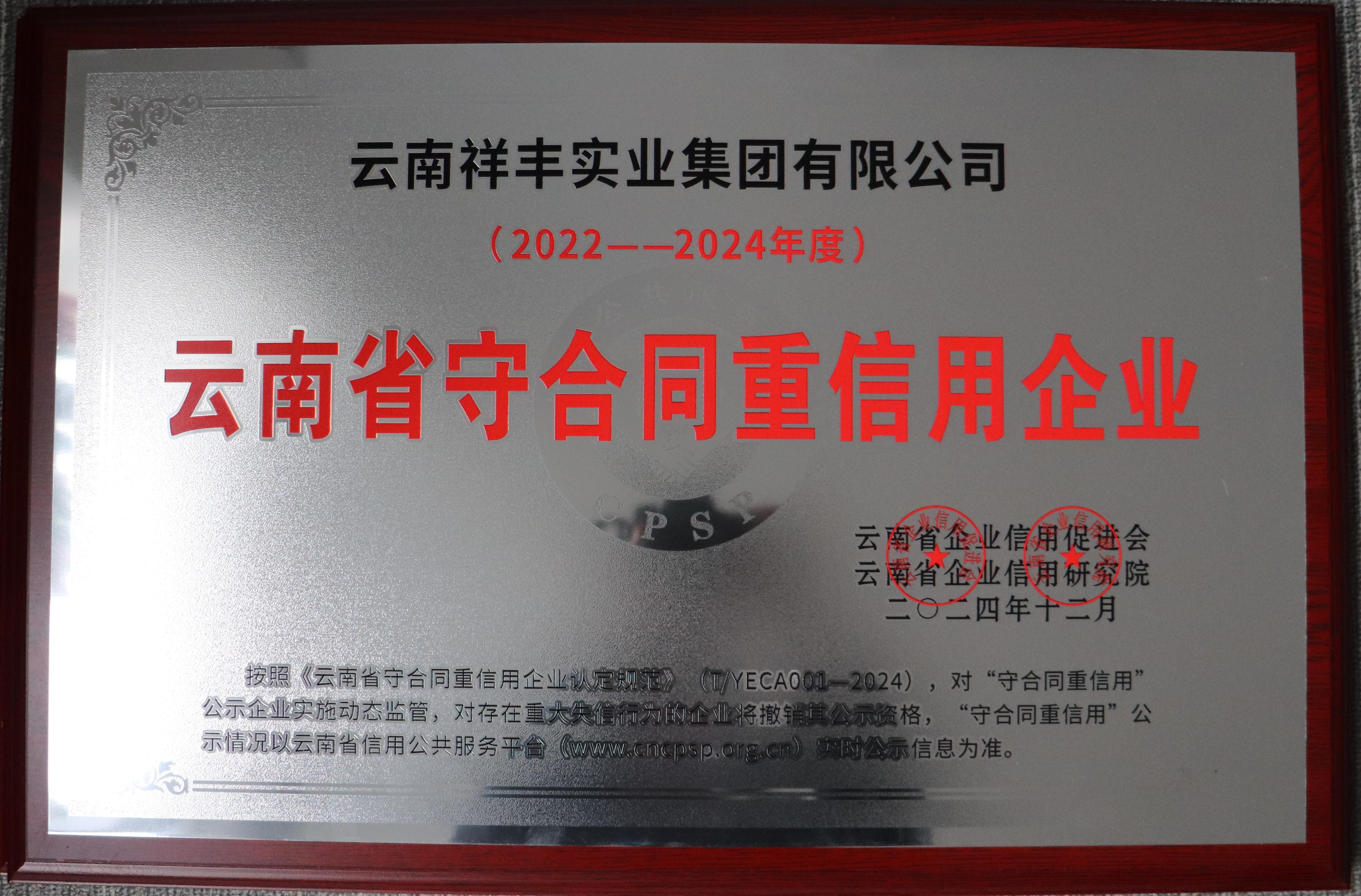 云南省“守合同重信用”企業(yè)證書